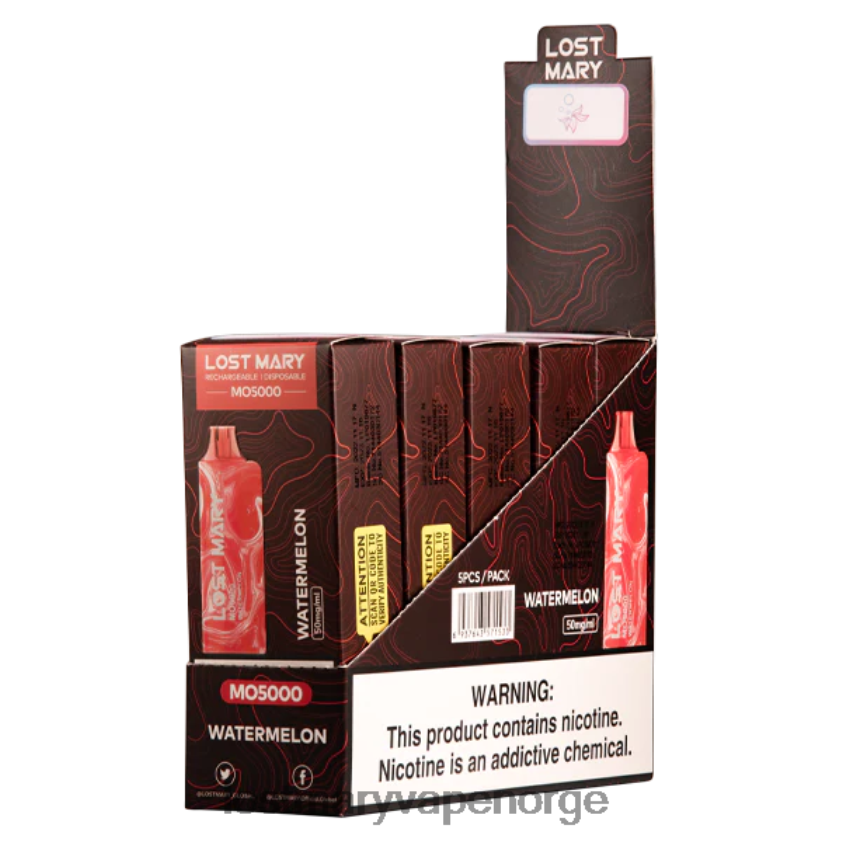 the watermelon lost mary mo5000 vape bruker en førsteklasses mesh-spiral og førsteklasses saftige vannmelon vape-aromaer, blandet med en frisk myntepust for å gi en enestående vape-opplevelse.